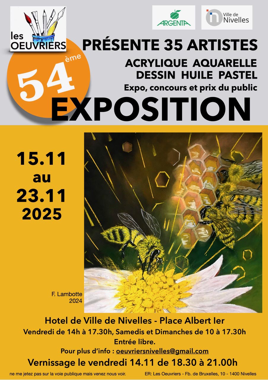 35 membres ont exposé leurs peintures à l’aquarelle, acrylique, huile et pastel pour un total de 145 oeuvres dans la salle des mariages de l’Hôtel de Ville de Nivelles avec beaucoup de succès.